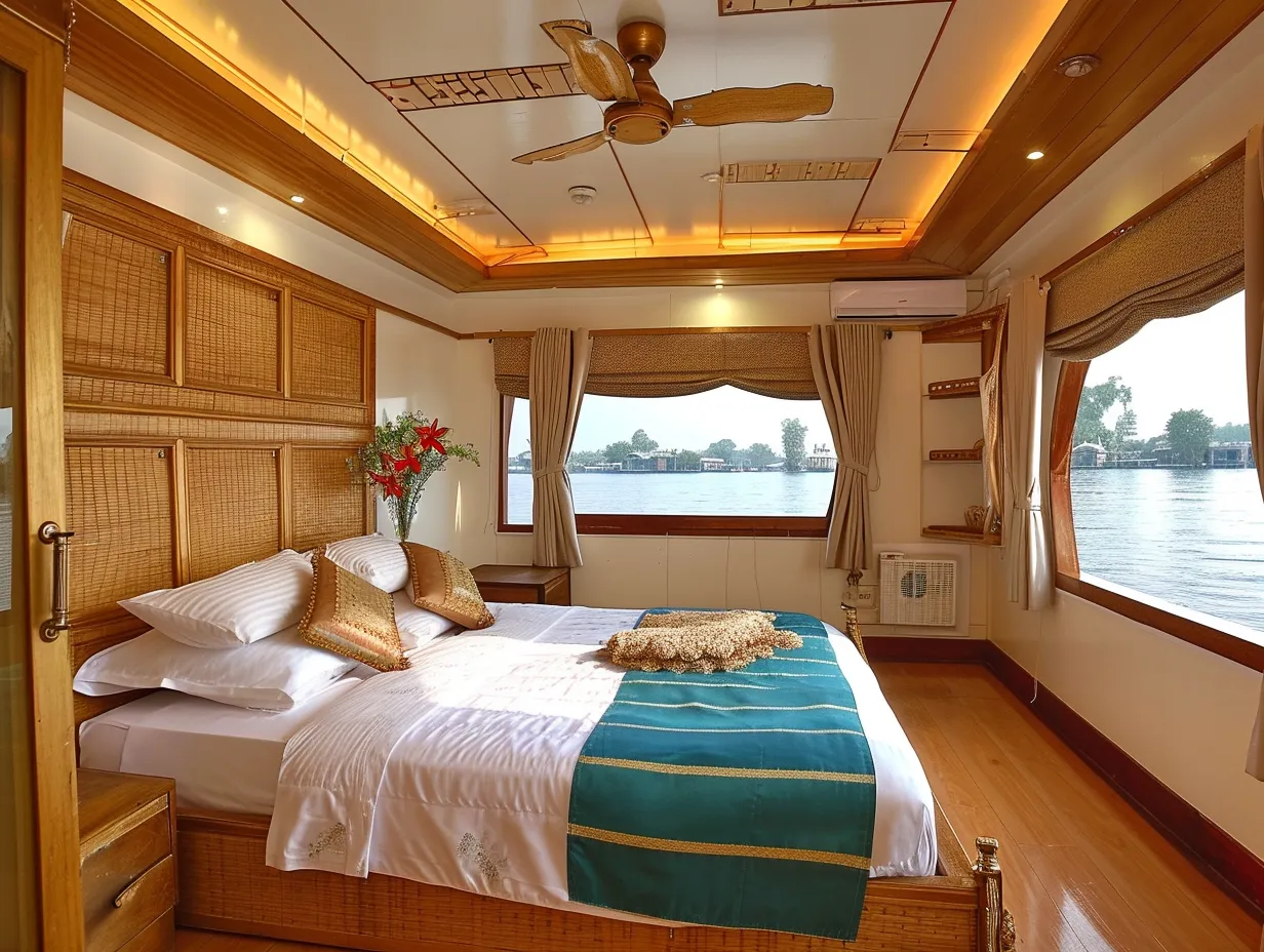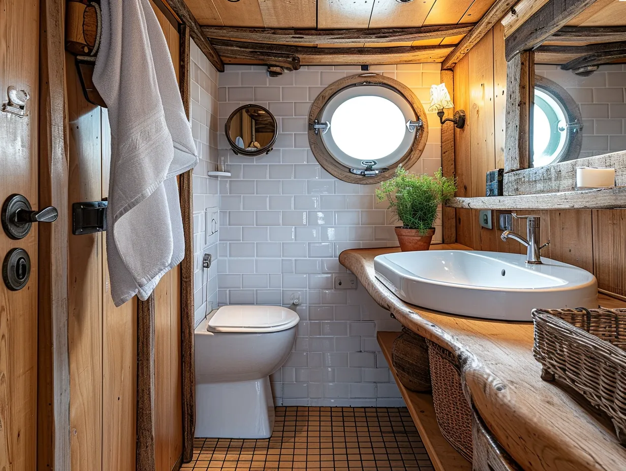 And for those balmy summer days, a unique touch: a propeller fan installed right above the bed. It’s not just a functional addition; it’s a nod to the nautical spirit of the houseboat, keeping the couple cool as they drift off to sleep with the view of nature right in front of them. Truly, this bedroom is a sanctuary of comfort and style, making it a perfect escape within an already magical home.