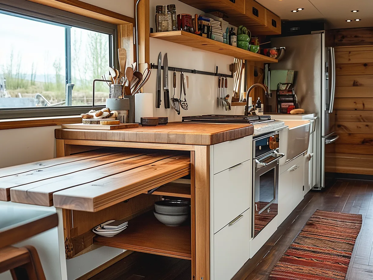 The integration of state-of-the-art technology in such a small space is nothing short of remarkable. From a hidden dishwasher to a pull-out countertop that doubles as a dining table, every element has been thoughtfully included to enhance the living experience without overwhelming the area.
