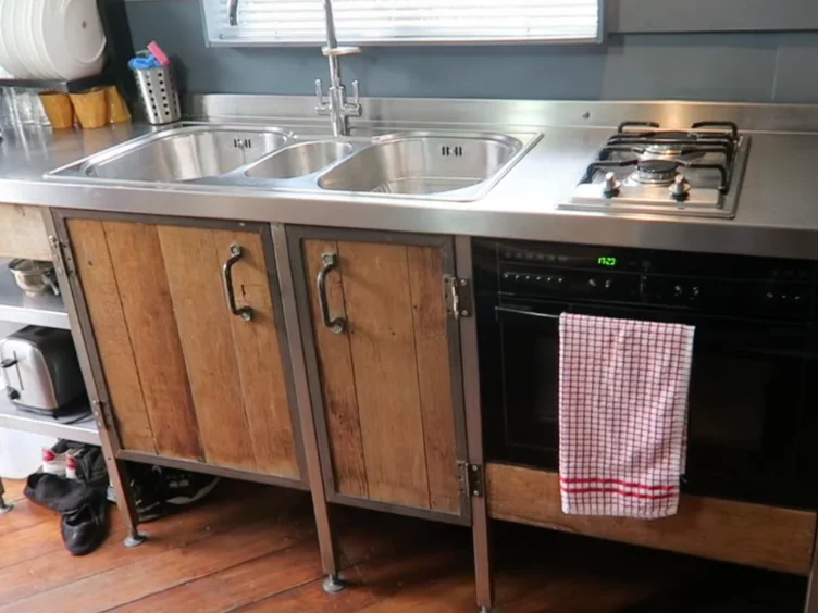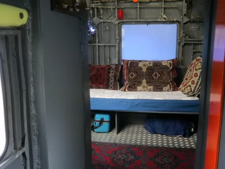 Adjacent, the kitchen area, affectionately known as the officer’s mess, is equipped with stainless steel appliances and plenty of space. It ties the helicopter’s original purpose with the practicalities of a modern kitchen, making it ideal for cooking and spending time together.