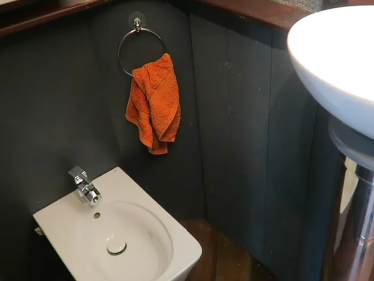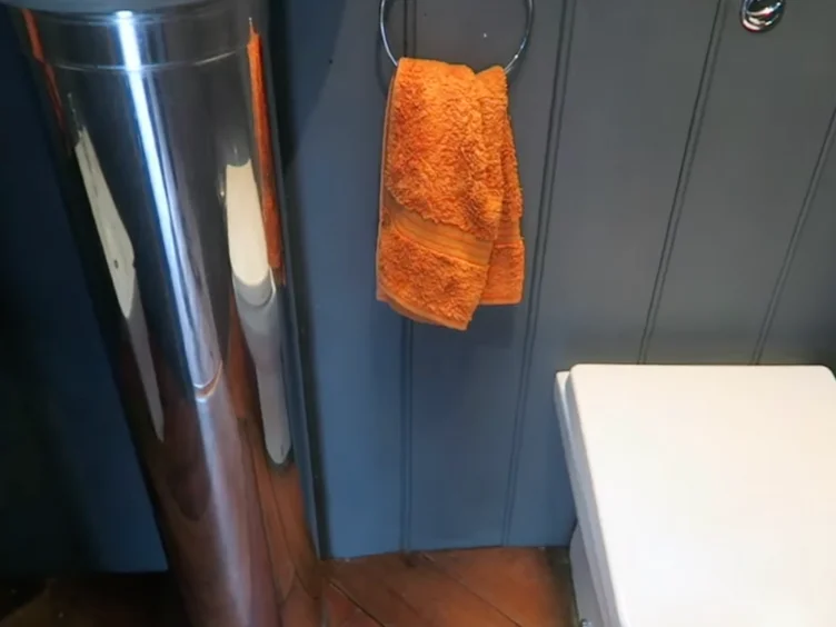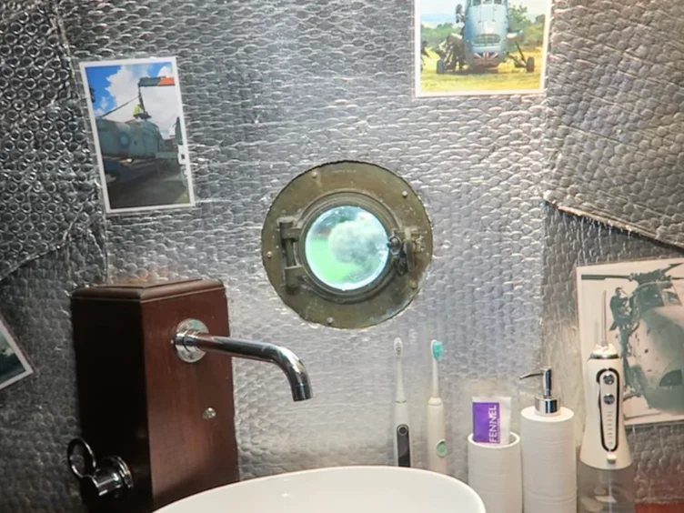 In this unique home, the bathroom is a small but special spot. It’s not just a place to go; it’s like a tiny museum. The walls are covered with pictures that tell the story of how this home used to be a helicopter and how it changed into the house it is now. Even though the bathroom is small, it’s designed really smartly to make sure it’s comfortable and works well. These pictures add a fun touch, making every trip to the bathroom a quick peek into the home’s exciting history.