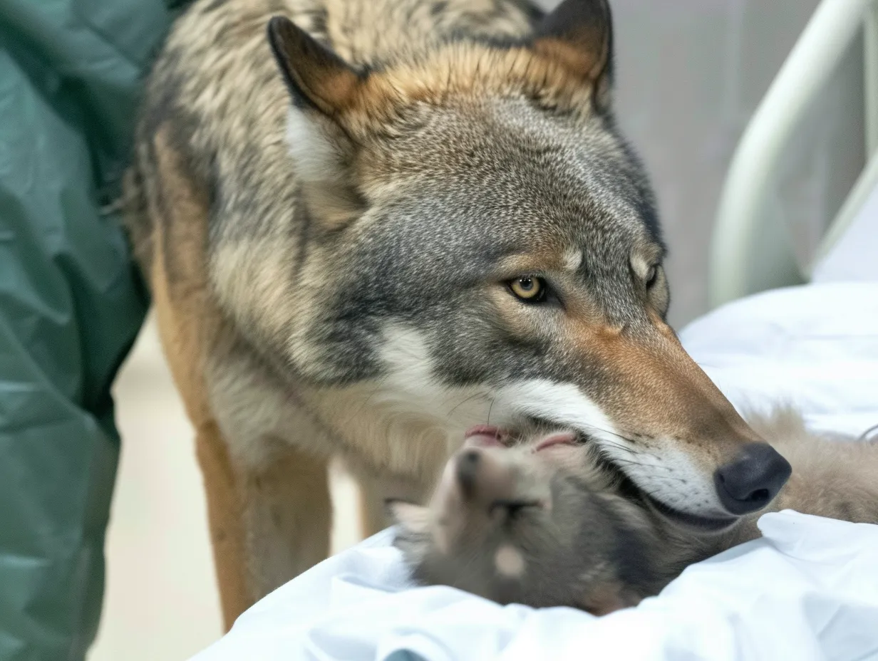 However, in the midst of the chaos, Katie spotted something that stood out. The wolf had something in its mouth – something small and definitely not typical for a wolf to carry. It looked like a tiny animal. This unusual sight sparked Katie’s curiosity, pushing her fear aside. She felt a strong urge to act, realizing there was more to the situation than just a wolf invading the hospital. The image of the wolf, normally a figure of fear, gently carrying this small creature, stirred a deep need in Katie to find out why and to help.