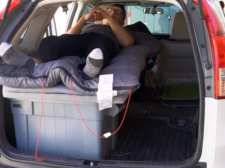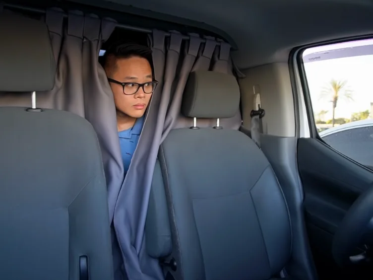 Step inside Jake’s car, and you’ll find a marvel of efficiency and design. What once was a standard sedan has been transformed into a cozy, functional living space. The backseat, now a comfortable bed with storage underneath, maximizes the small space. Soft, battery-powered lights hang from the ceiling, creating a cozy atmosphere, while insulated curtains offer privacy and temperature control.