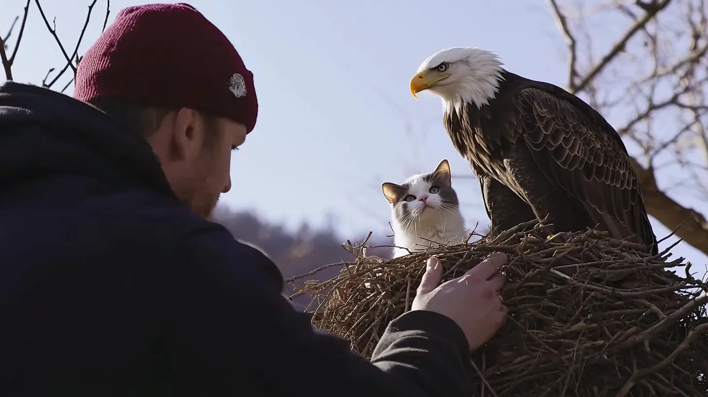 The group, led by Mr. Larson, cautiously approached the nest. They noticed movement at the top of the tree. Could it be the eagle? They had to find out. As they got closer, the sight that awaited them left everyone speechless. The eagle’s nest wasn’t just home to the bird—it was also housing the missing cat!