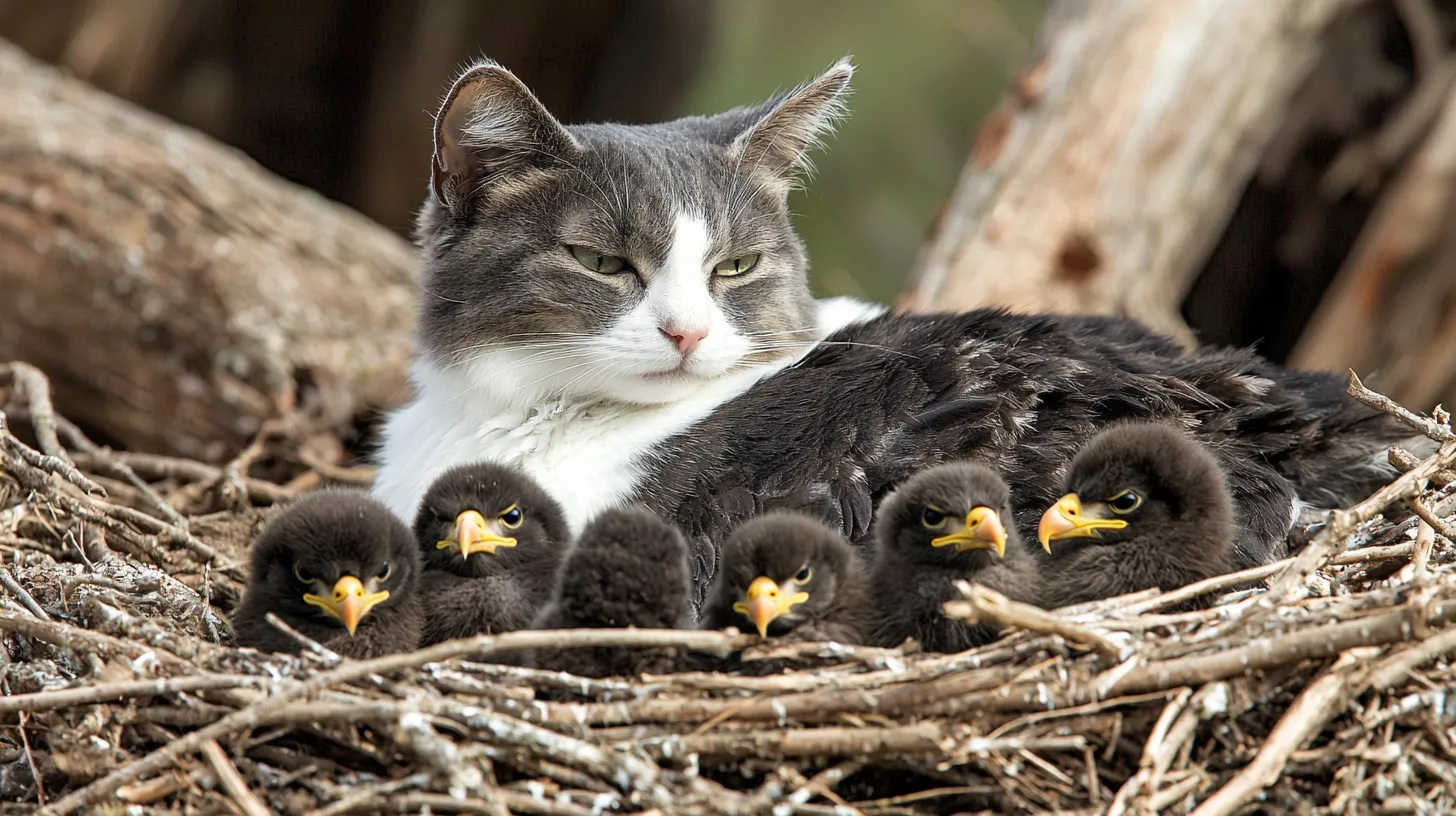 As the neighbors drew closer, they could hardly believe their eyes. There, nestled among the sticks and branches of the eagle’s massive nest, was Mrs. Fitzgerald’s cat. But the real surprise came when they saw the cat playing with three baby eagles, gently pawing at them as if they were her own.