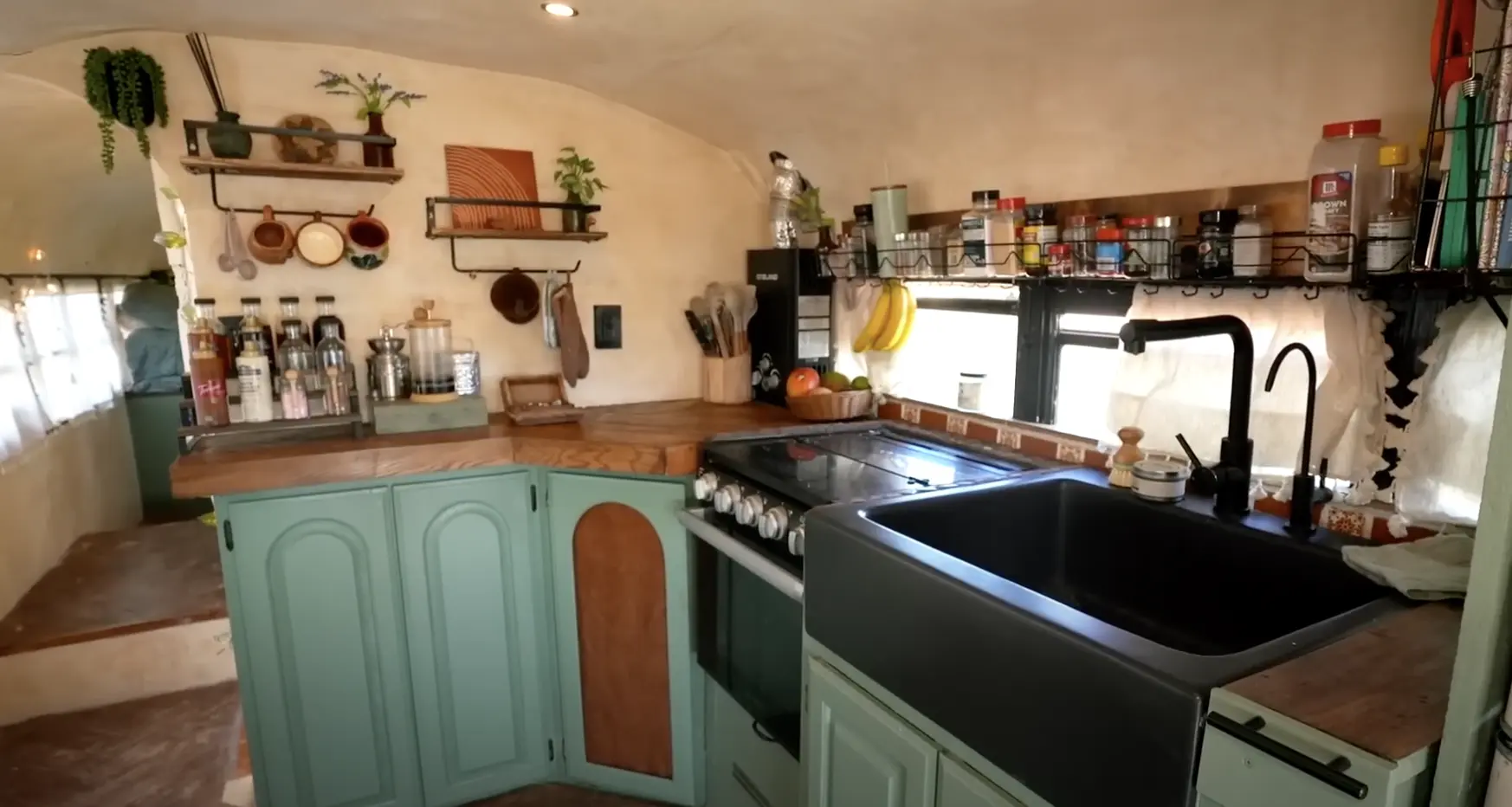 Each detail, from the vibrant Mexican tiles to the rich wood floors, creates a comforting atmosphere. The kitchen, the heart of their tiny home, is both spacious and thoughtfully organized, fostering home-cooked meals that strengthen their bond. A massive farmhouse sink doubles as storage while driving, complemented by a clever pull-out pantry—smart design for small spaces. Who wouldn’t love meals on wheels?