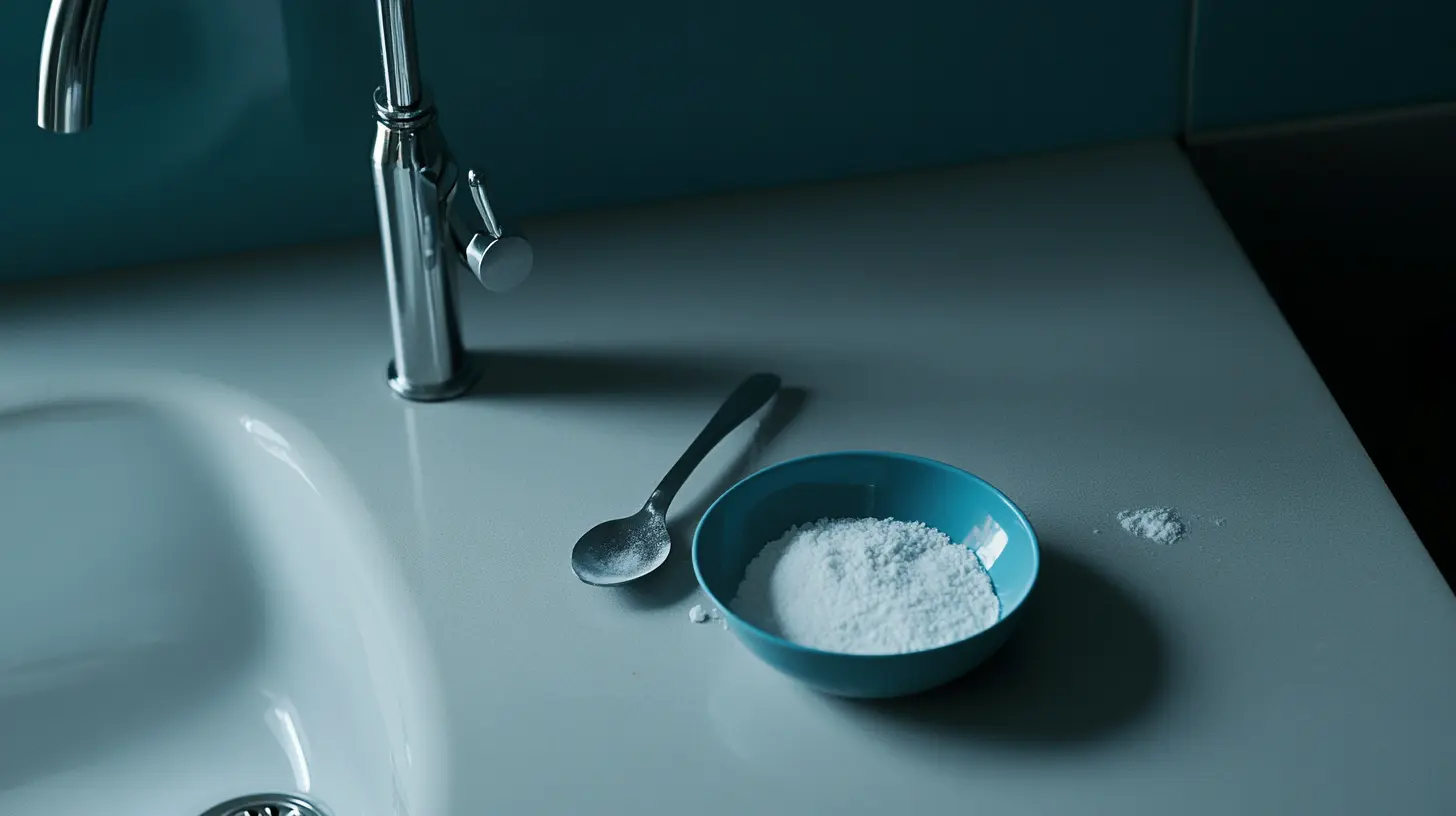 - Pour half a cup of white vinegar over the baking soda. You’ll notice some fizzing — that’s the reaction working to break down the gunk!