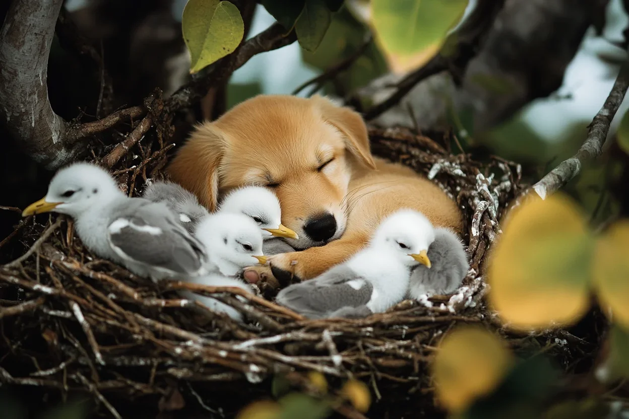 Over the following days, something incredible unfolded. The seagull continued to care for all five creatures equally. And the puppy? It adapted completely—barking softly when a strange gull approached, and even cuddling with the chicks at night.