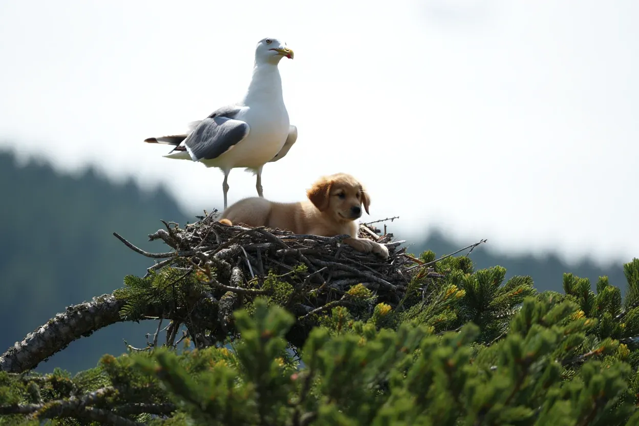 The puppy was lying calmly among four fluffy seagull chicks, its golden fur glowing against the tangle of twigs and feathers. The seagull—the very one that had taken the dog—was perched nearby, watching protectively from a post. It made no aggressive move. If anything, it looked… maternal.