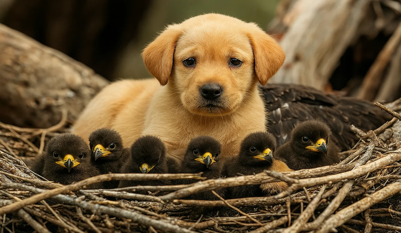 When they returned, they couldn’t believe their eyes—the eagle had begun bringing small rodents to the nest, leaving them for the puppy to share with the chicks. The bird, once seen as a potential threat, was now a partner in caring for the puppy.
