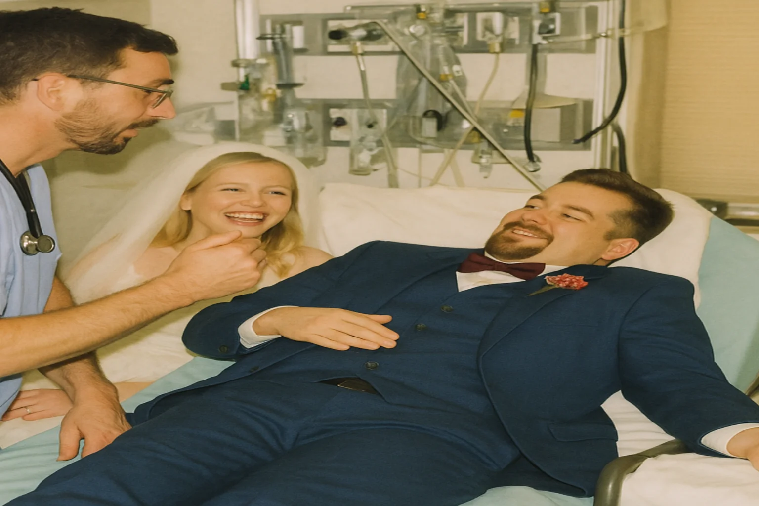 “This is my husband and I the night of our wedding. His “friends” thought it would be funny to put a fish hook on the steering wheel of the car, because I “HOOKED” him.