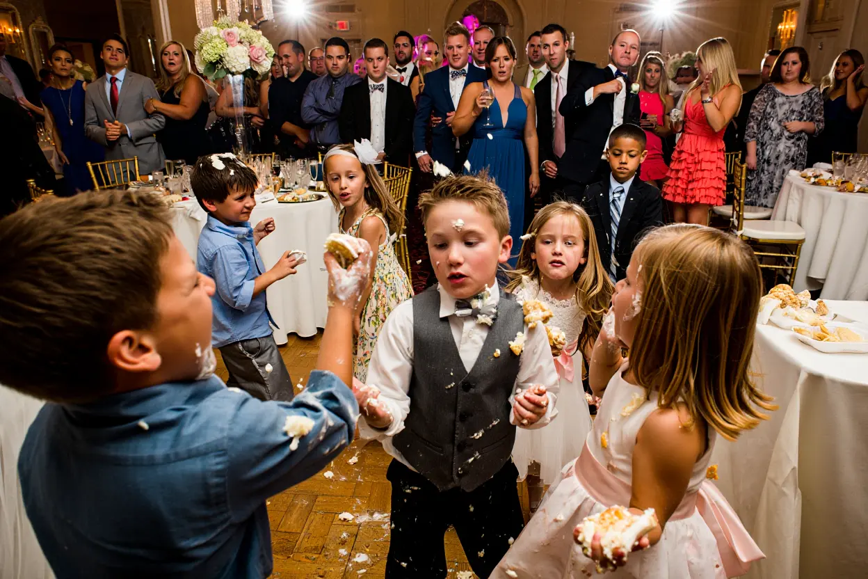 The food fight escalated quickly. The kids threw snacks everywhere, laughing and causing chaos. It didn’t take long before cupcakes flew through the air, and the reception hall descended into mayhem. Julie rushed around, trying to regain control, but it was too late. The scene had spiraled beyond her.
