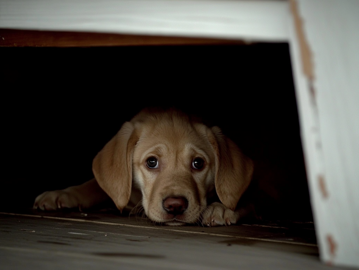 Without a second thought, Mark raced outside, his heart pounding. He reached the porch and found Max, his small whimpers giving away his location, his wide eyes full of terror. He scooped him up gently, feeling his shaky body in his arms, and hurried him inside.
