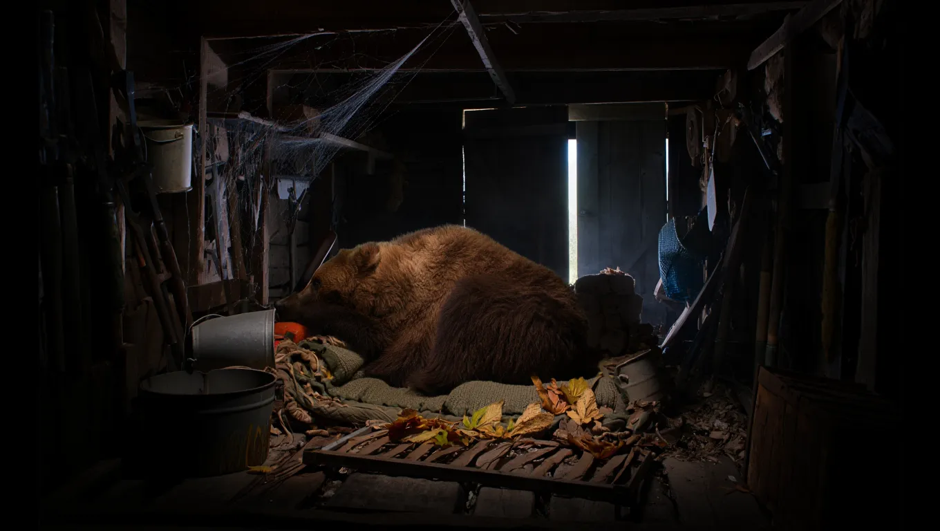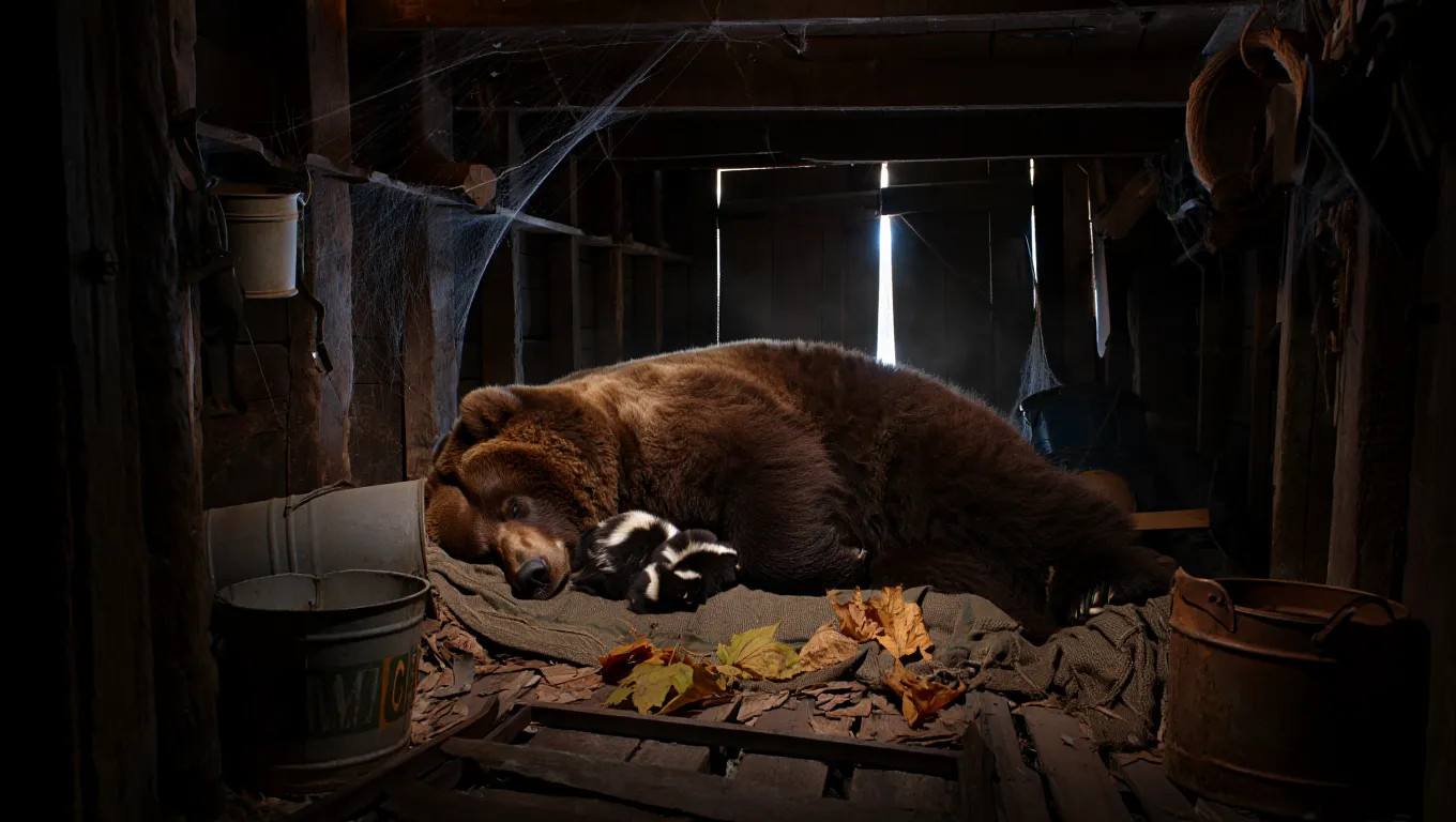 The light barely reached the back wall, but it was enough. In the far corner, stretched out across a bed of old blankets and leaves, was a fully grown bear. Asleep.