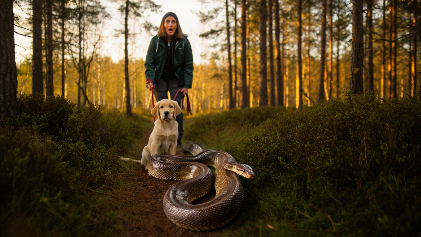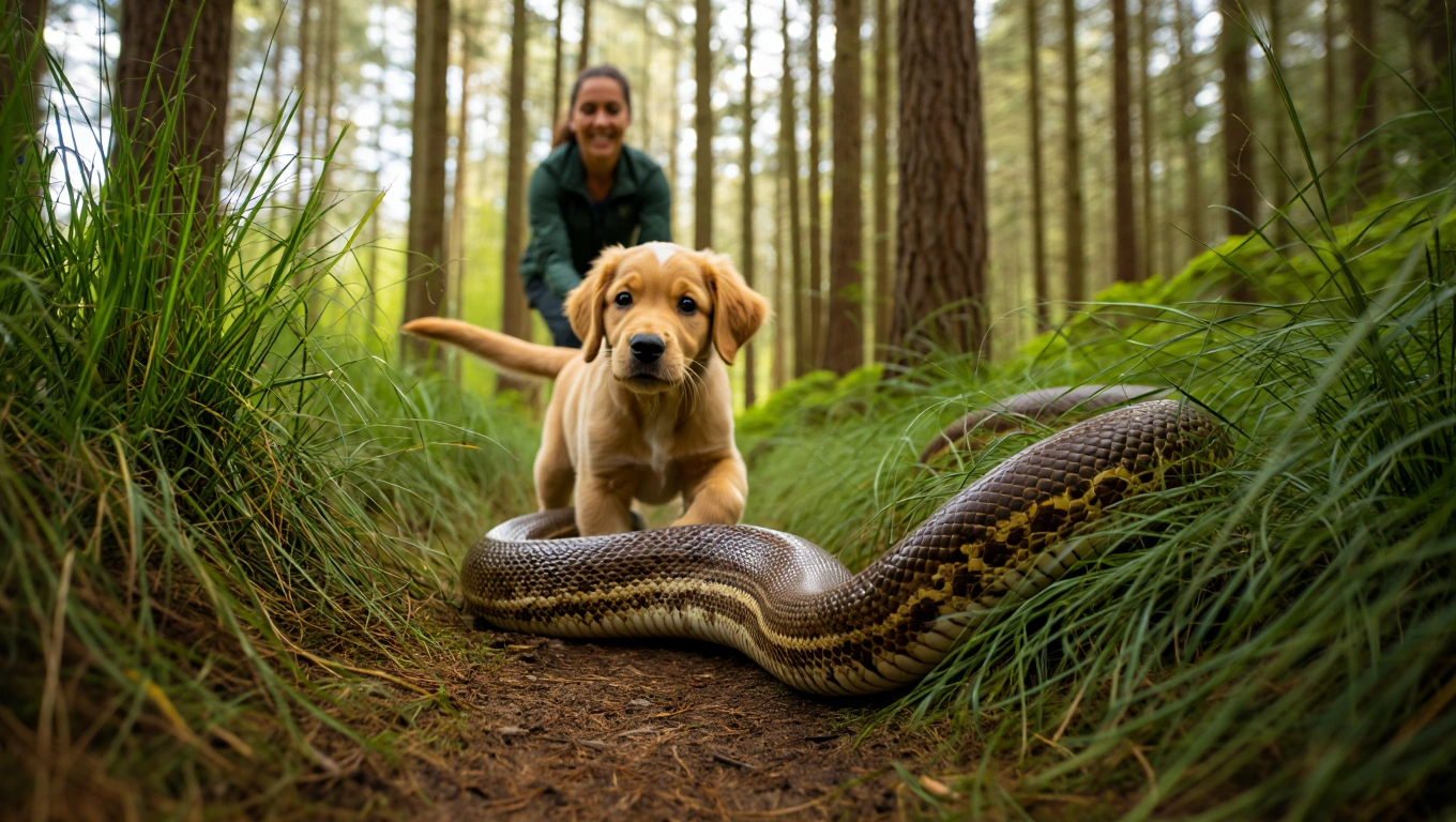 The puppy wasn’t scared. He wasn’t even barking. He trotted happily alongside the snake, tail wagging, like they’d arrived together.