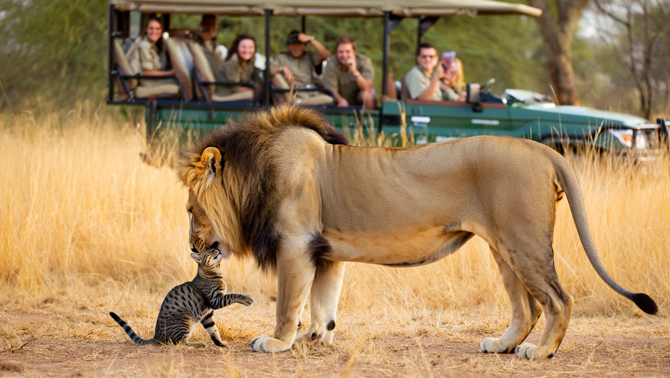 Gasps rippled through the jeep. But the lion didn’t roar, didn’t lunge. Instead, it lowered its massive head… and nudged the cat gently with its nose.