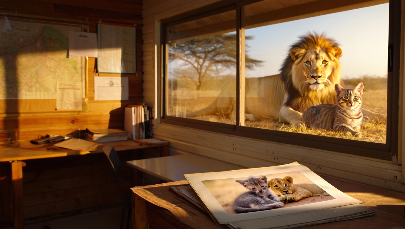 Back at the ranger station, he rummaged through an old drawer and pulled out a photo. Laminated, worn from time. It showed a lion cub curled up with a tiny grey kitten.