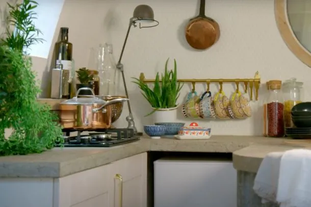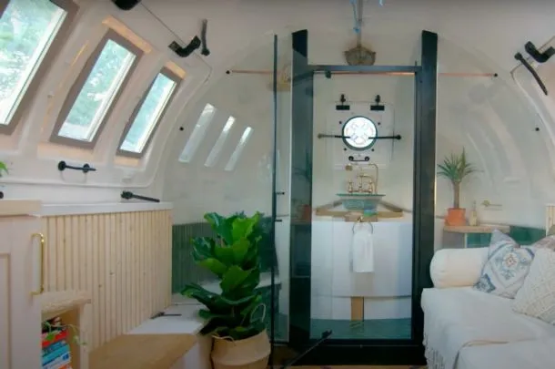 Today, the submarine feels more like a minimalist tiny home than a military relic. It features smooth flooring, soft white walls, and cozy lighting tucked into bulkheads. A tiny kitchenette fits perfectly in the galley, a small bed nestles under an old periscope, and her reading corner? It’s where torpedoes once sat.