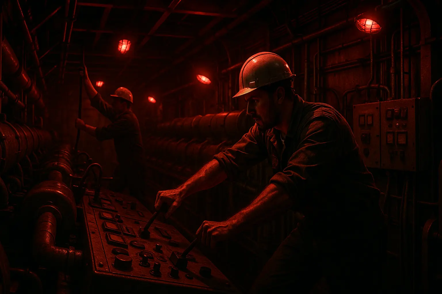 Down in the engine room, Chief Engineer Tomas had an idea, risky, but their only shot. The ship had a rarely used “silent drift” mode for emergency breakdowns. It cut all power and used ballast shifts to float with the current, no engine, no signature.