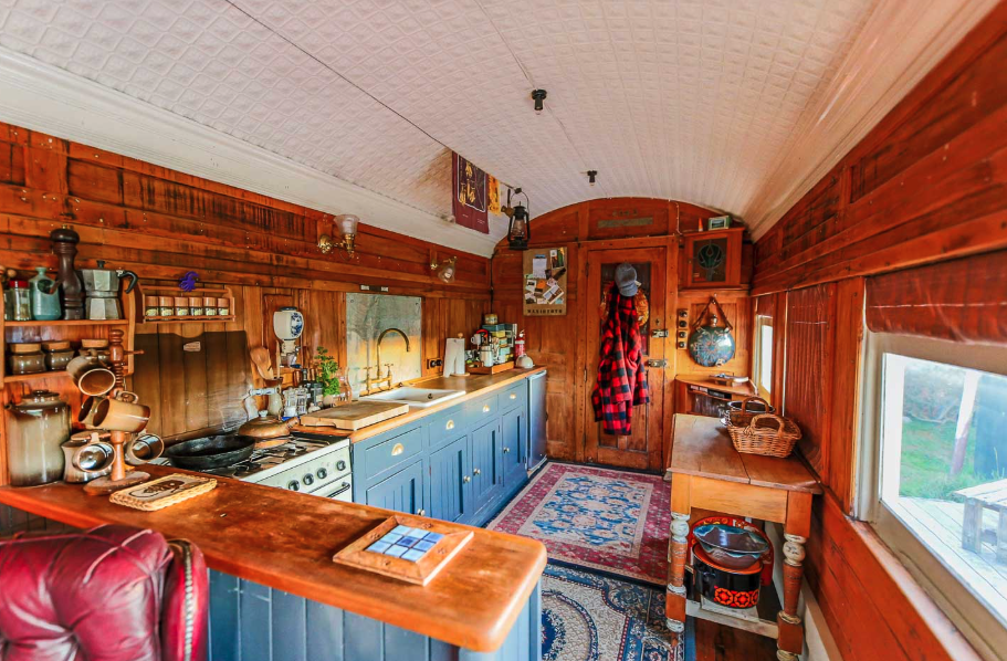 Space is limited inside the train cart, so every detail has been designed for practicality. The kitchen, for example, is a tiny but efficient space, featuring handcrafted cabinetry made by Anne’s granddaughter, Sarah. Its highlight? A quaint window that opens to views of the lush countryside, making cooking a surprisingly delightful experience.