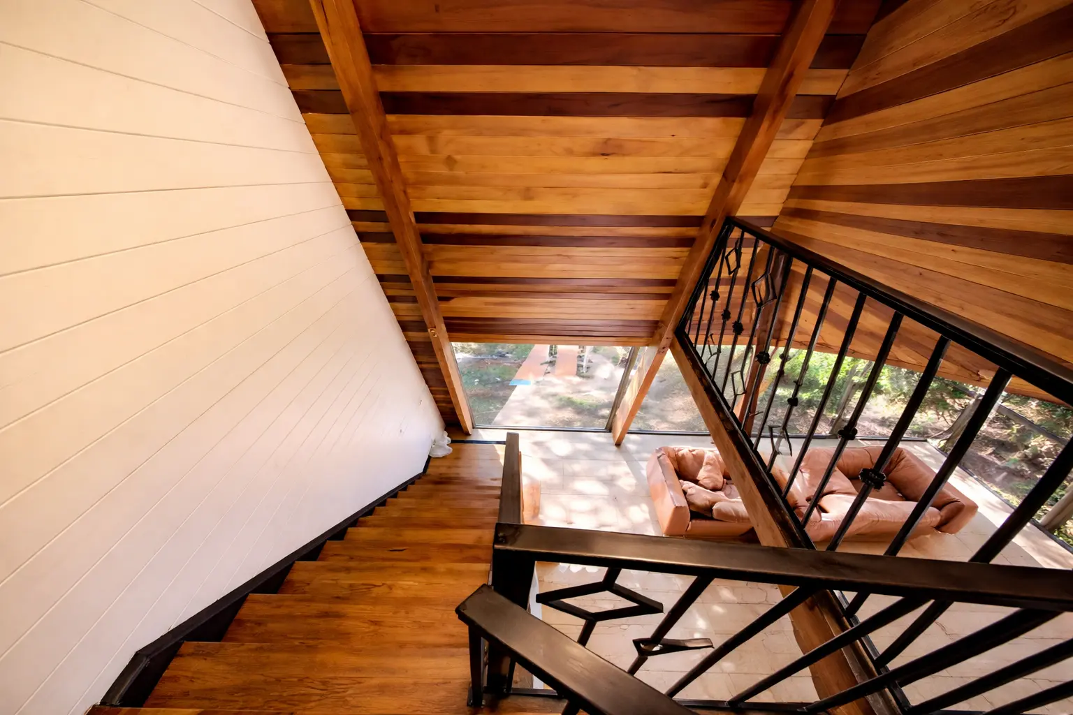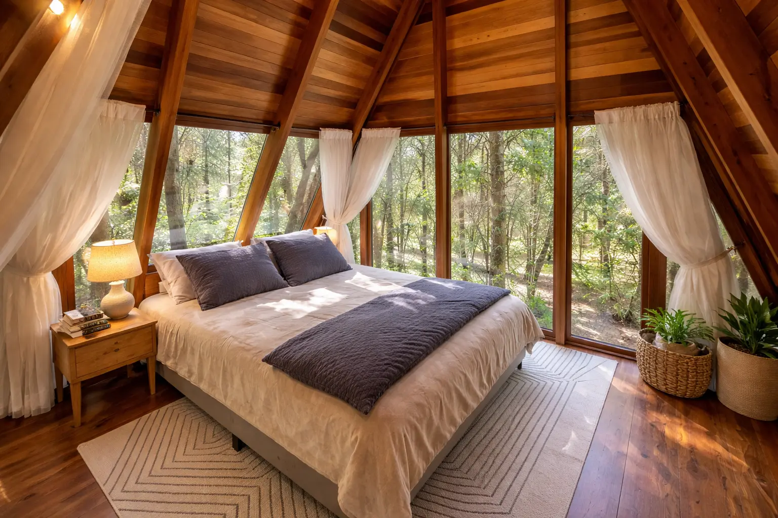 Upstairs, the bedroom overlooks the trees, framed by large windows that bring in natural light throughout the day. It’s quiet in a way that’s hard to explain — the kind of quiet that makes you slow down without even trying. She mentioned that this was always the idea. Not just to build a house, but to create a space that felt like a retreat.