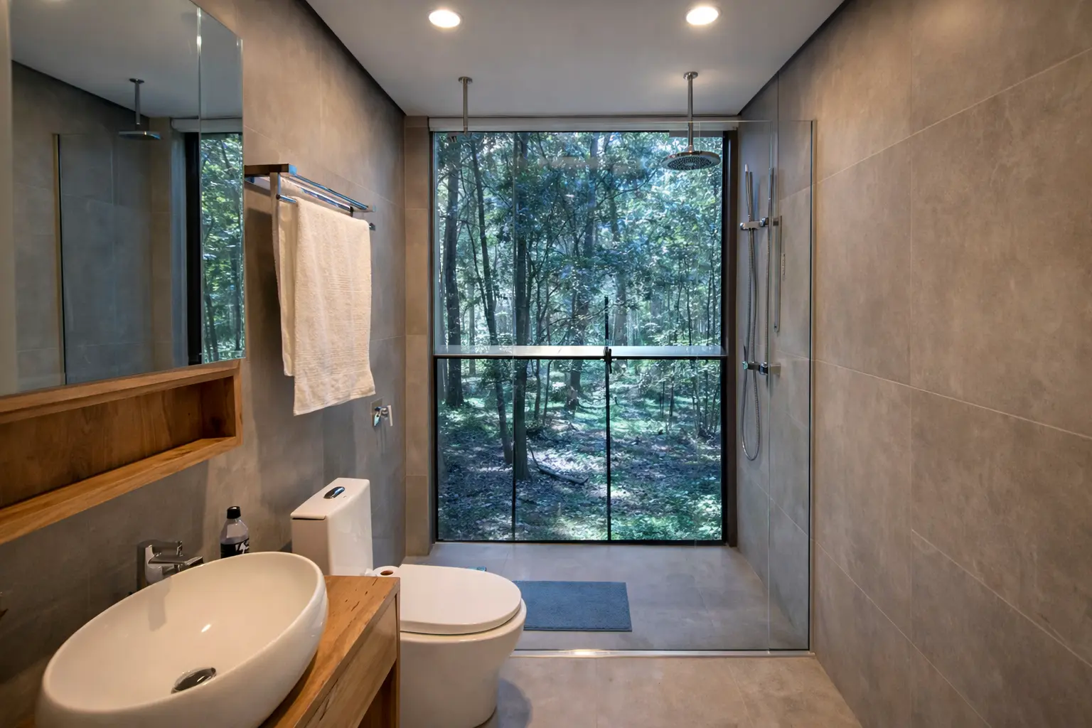 Inside, the cabin opens up in a way that feels far from basic. The bathroom, in particular, stands out — not because it’s oversized, but because it’s thoughtfully designed. Clean, modern, and surprisingly refined, it feels closer to something you’d expect in a boutique stay than a self-built cabin in the woods.