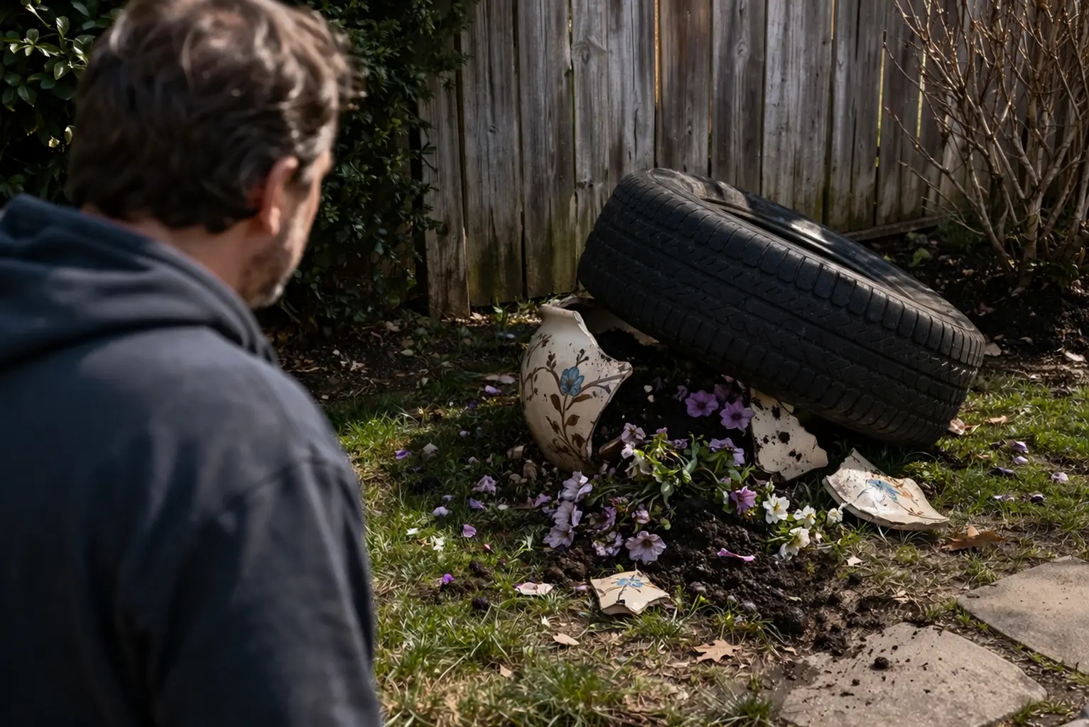 This time, there was no HOA representative standing around. No police. No neighbors pretending not to stare from across the street. This time, it was just Mark, a broken planter, and one very clear reason to stop waiting for someone else to handle it. He looked over the fence toward Darren’s backyard, then down at the tire sitting in the middle of his lawn.