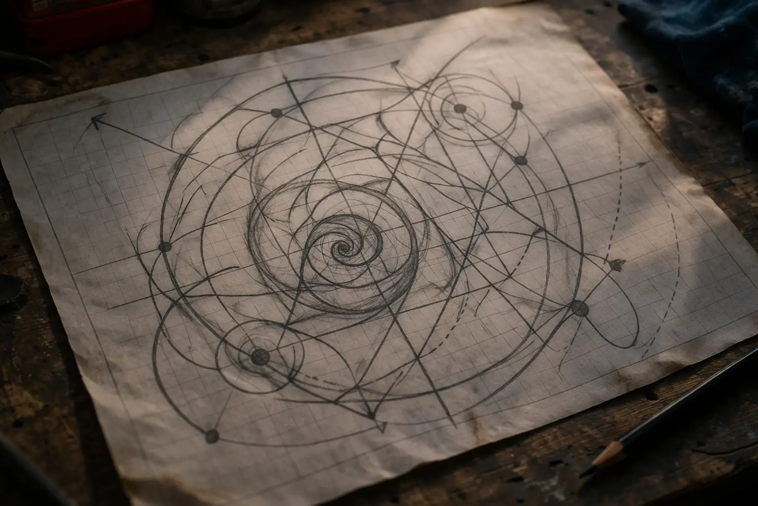 Mark stepped closer. The drawings were covered in circles, curves, measurements, arrows, and shapes that didn’t immediately resemble anything he could make sense of. Some looked layered. Some looked almost playful — but not in a way he could fully explain. One page had repeating rounded forms marked with dimensions.
