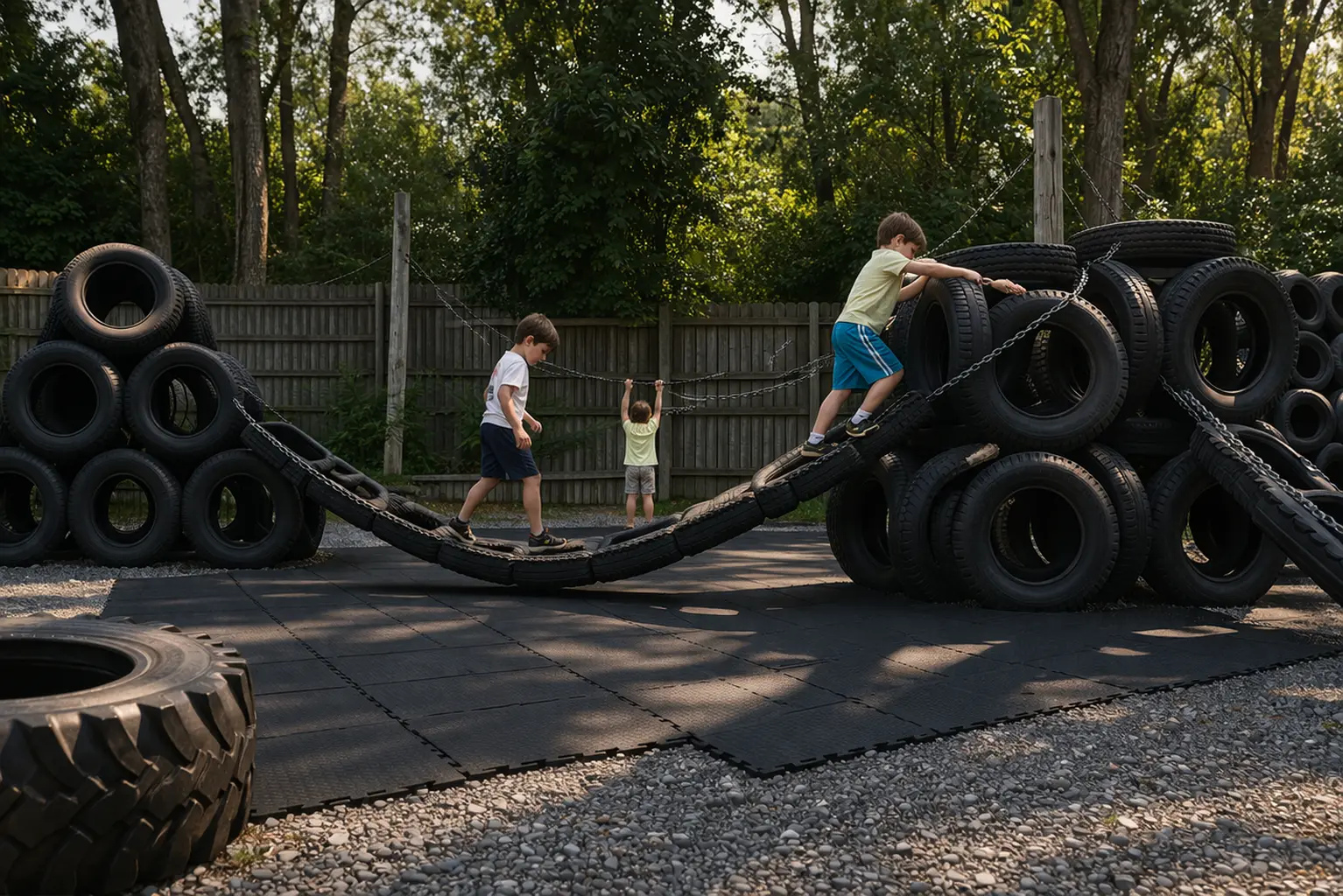 A few weeks later, the project was finished. Where there had once been towering stacks of tires and nonstop complaints, there was now a bright, creative play space full of movement and noise for all the right reasons. Kids climbed over the tires, balanced along the paths, and ran across the rubber flooring like it had always belonged there.