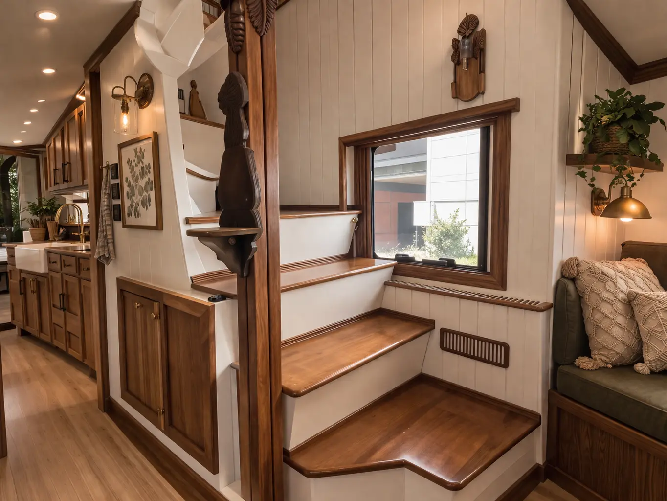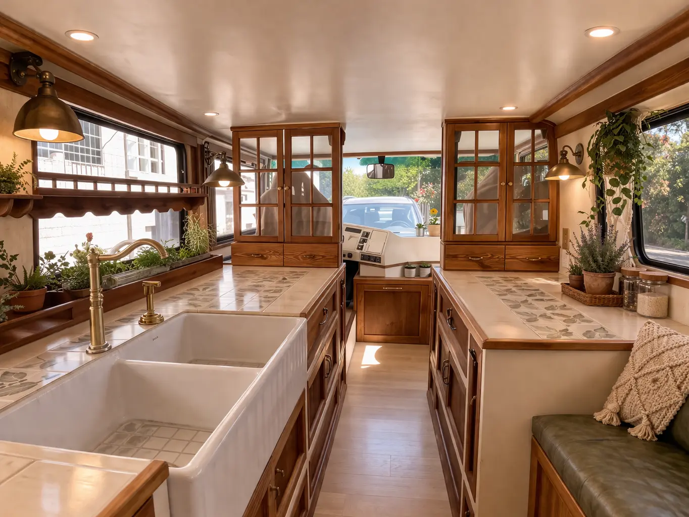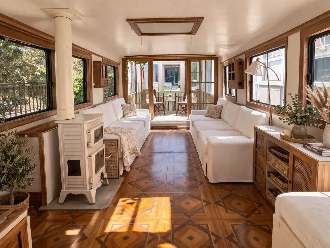 The lower level has been completely transformed into a bright, surprisingly cozy living space. What once would have been rows of passenger seats is now a warm, functional interior with enough room to actually breathe. There’s a compact sitting area, a practical kitchenette, and clever little design choices throughout that make the space feel more like a thoughtfully planned tiny apartment than a converted vehicle.
