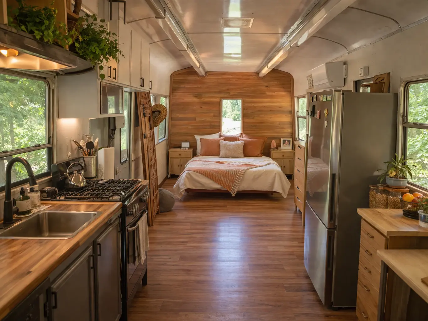 Mila started with the far end of the carriage, transforming it into a bedroom that feels tucked away from the rest of the world. She liked the idea of sleeping at the “end of the line,” as she jokingly calls it, and turned the compact space into the softest room in the house. Instead of trying to cram in too much furniture, she kept the layout simple: a bed framed by layered blankets, a narrow side table, a reading lamp, and a vintage mirror she found at a flea market. The walls were finished in warm, earthy tones that made the room feel less like a train carriage and more like a tiny retreat hidden in the woods. She even kept some of the original structure visible, letting the train’s history remain part of the atmosphere rather than covering up every trace of it.