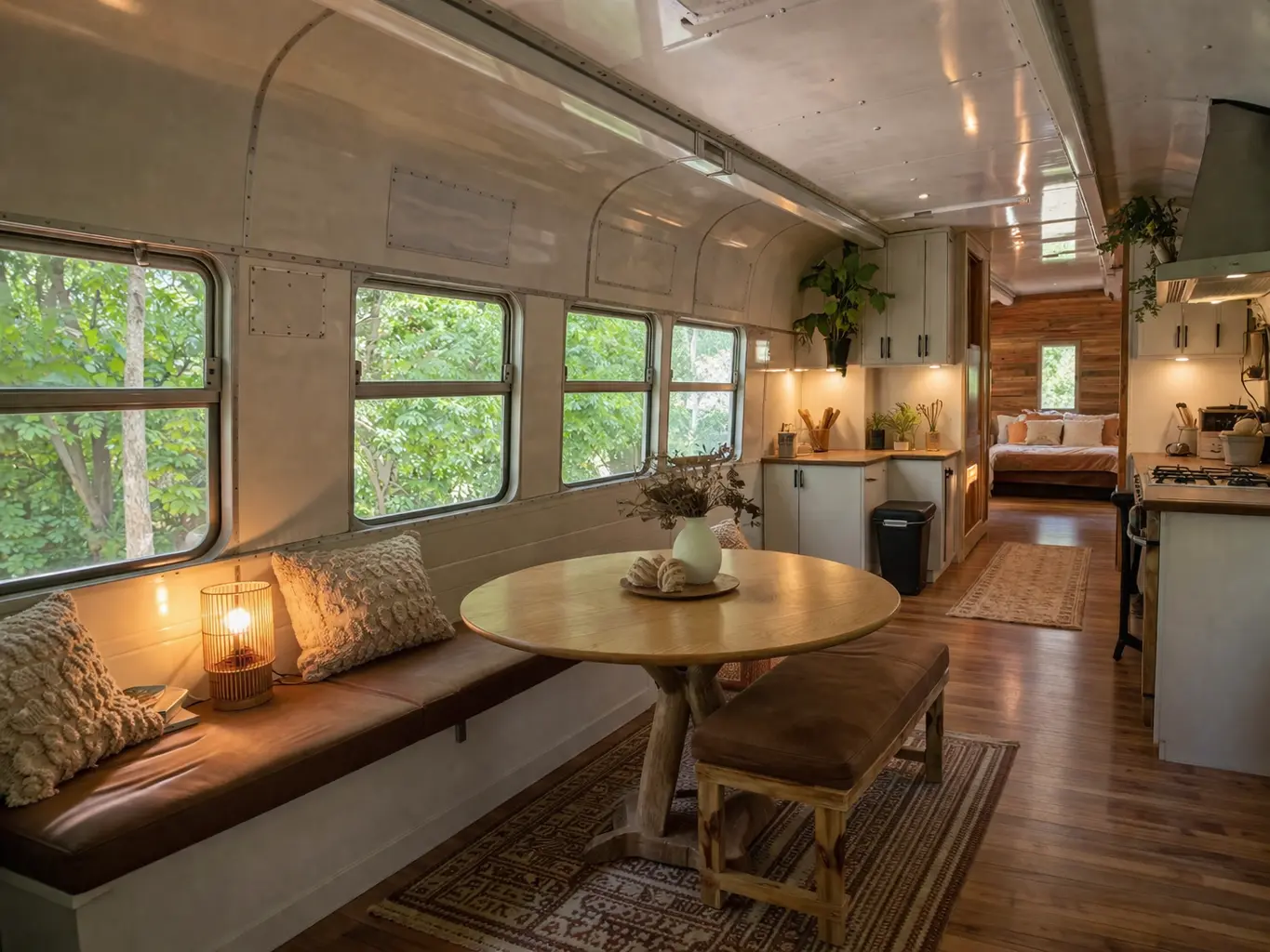 Because the train is narrow, Mila made sure the dining table earned its place. It isn’t just for meals. On some days, it’s her desk; on others, it’s where she sketches ideas, trims flowers, or sits with friends over coffee. A built-in bench on one side saves space, while the other side has a pair of chairs she repainted herself. A pendant lamp hanging low above the table gives the whole area a golden glow in the evenings, turning a simple dinner into something that feels unexpectedly special.