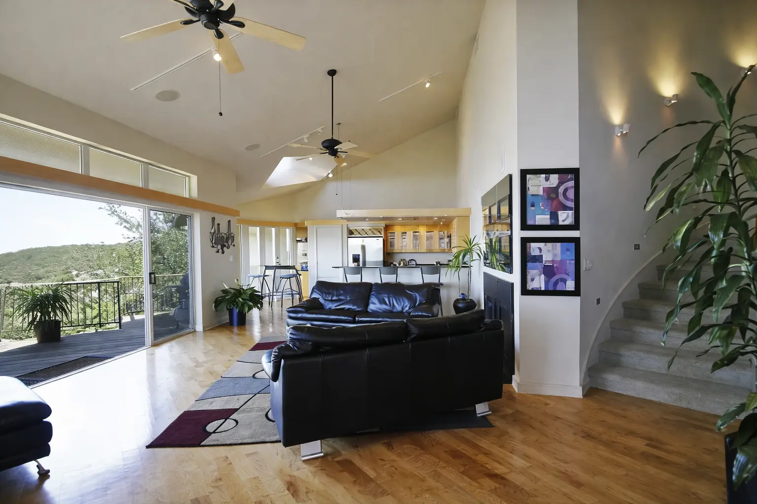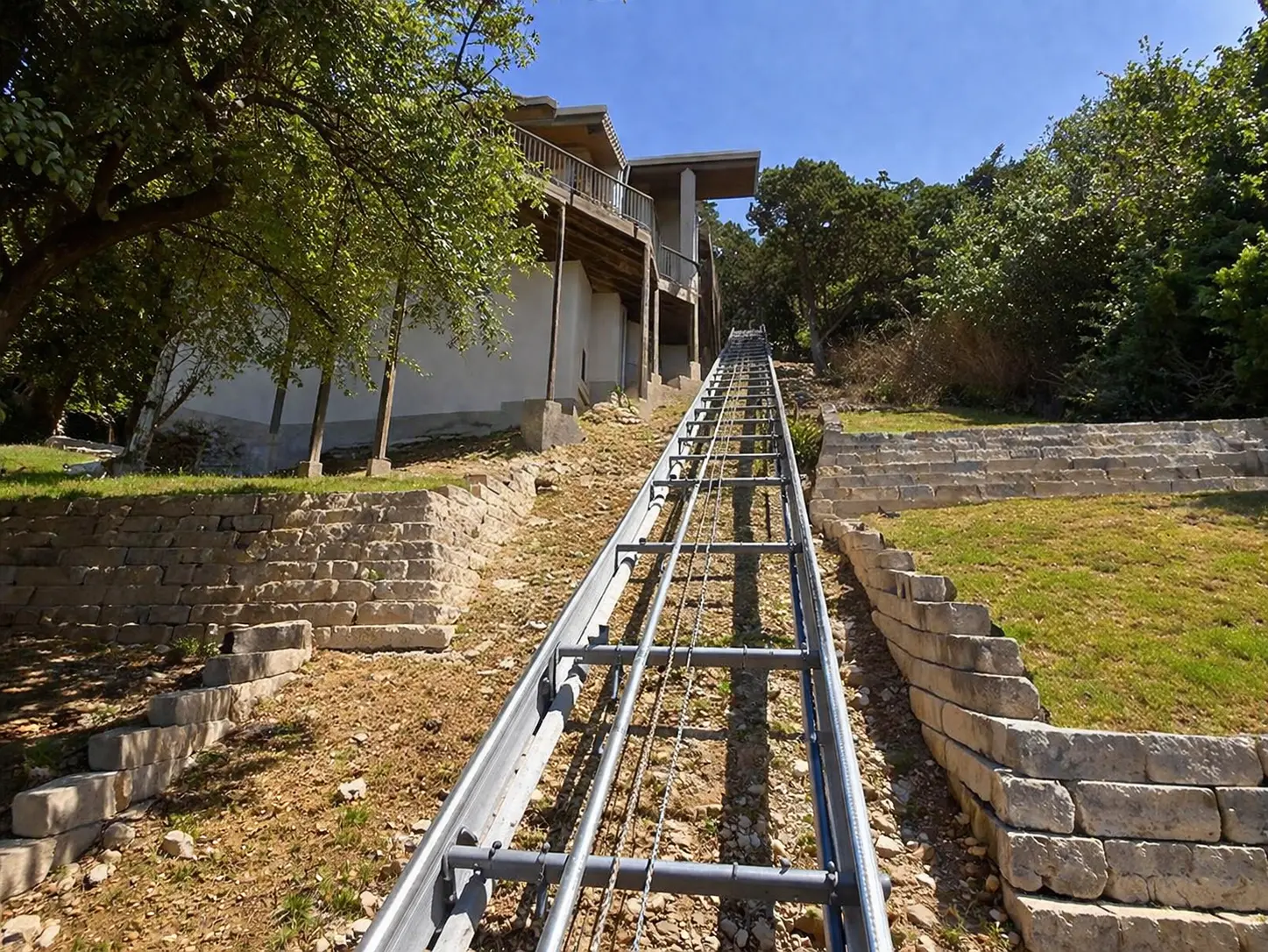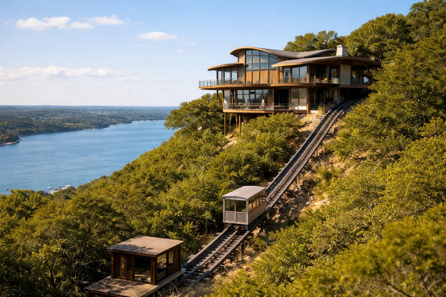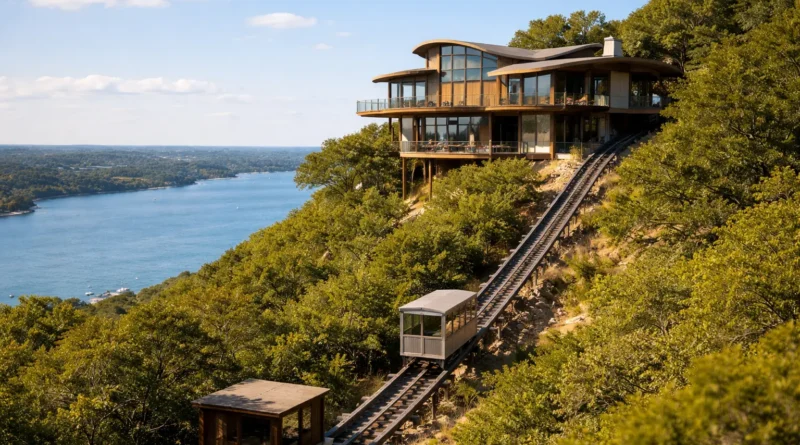 Most homes greet you with a driveway, a gate, or maybe a front porch. This one begins with a tram. That is what makes this place so instantly fascinating. Before you even step inside, the house has already turned the everyday act of coming home into something memorable. It sits high on a steep hillside near Austin, Texas, overlooking Lake Travis, and reaching it feels less like arriving at a regular home and more like entering a private hideaway with its own little ritual. Instead of parking and walking up a path, you step into a small tram car and glide upward toward the front door. It is unusual, a little dramatic, and exactly the kind of detail that makes people stop scrolling and want to see more.