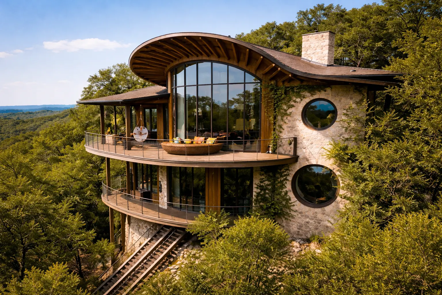 The house is not appealing just because it is difficult to reach. If that were the only interesting thing about it, the novelty would wear off quickly. What keeps it fascinating is the fact that the tram leads to a home that is visually unusual, too. It has curves where many modern houses prefer straight lines. It has playful features where other homes might choose predictability. The “fishbowl” design idea says a lot. It suggests a place built around openness, views, and a sense of immersion in the landscape. The result is a home that feels almost storybook from some angles and deeply personal from others.