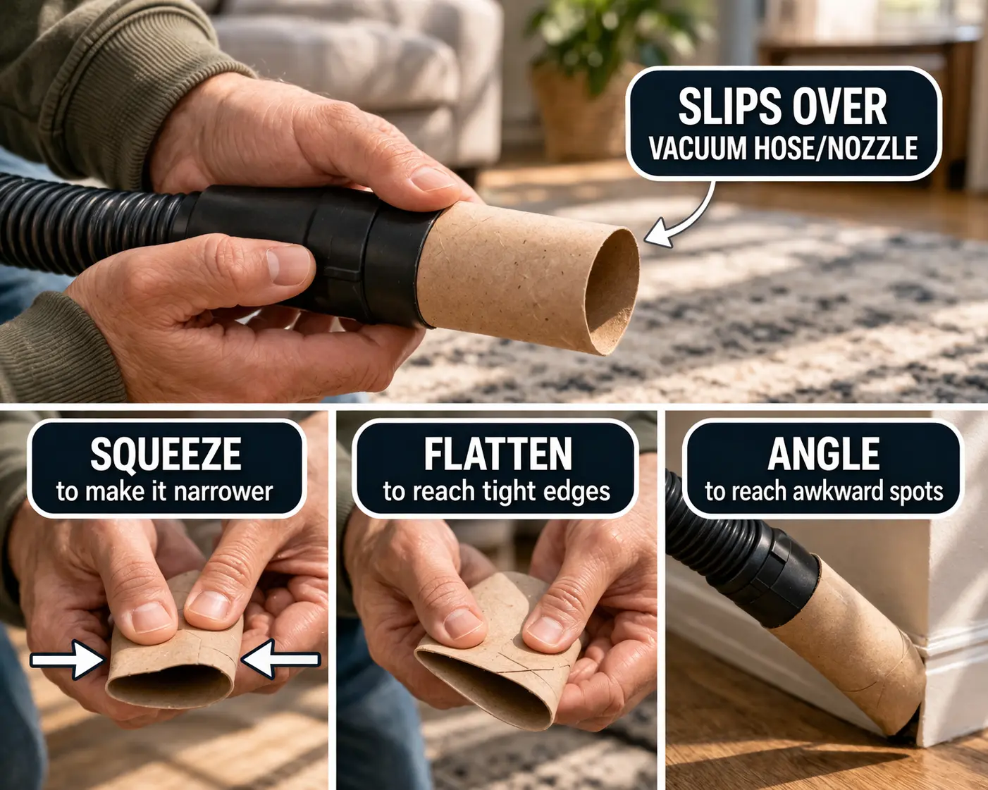 The trick works because of something most people don’t think about — flexibility. An empty cardboard toilet paper roll can be placed over the end of a vacuum hose or handheld nozzle, acting like a temporary extension. But unlike standard plastic attachments, the cardboard isn’t rigid. You can squeeze it. Flatten it. Angle it. And that’s what makes the difference.