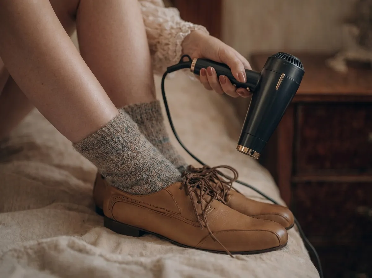 This is the quick fix people love because it feels satisfyingly dramatic: thick socks on, shoes on, and use the hairdryer all over your feet. And yes, for leather shoes, a little low heat can help soften the material enough to encourage a small stretch in the tight spots. A major footwear brand recommends using a hairdryer on low heat for about 20 to 30 seconds over the pinching area while wearing the shoes, then walking around until the leather cools so it keeps that adjusted shape. Used carefully, this can give fast relief when the issue is mild, and the material is genuine leather.