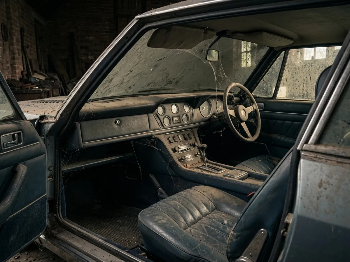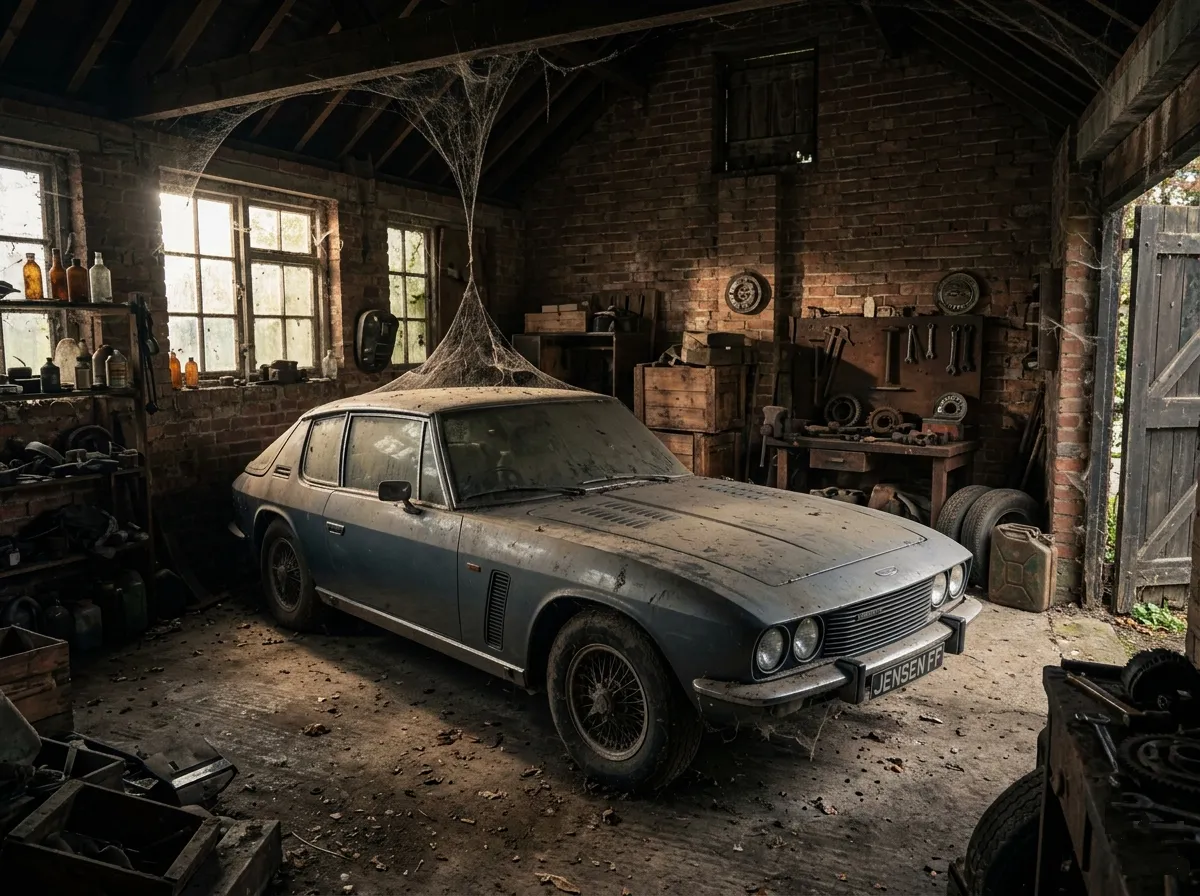 Mr. Pickard didn’t buy the Jensen FF as a collector’s toy or a weekend conversation piece. He owned several quarries in Staffordshire and wanted a comfortable, capable, all-weather car that could take him to construction sites and excavations without fuss. The FF’s advanced drivetrain was not just an engineering talking point. It made good sense for his use. He even specified fog lights and loud air horns, small additions that suited a man who wanted his expensive GT to handle the realities of work, weather, and rough surroundings. In effect, it was a highly advanced British grand tourer with Italian styling and an American V8, being used as a serious, working machine. Over the years, Pickard drove the car extensively while also maintaining it carefully. In 1973, he moved to the Isle of Man. By his death in 1997, the odometer showed around 60,000 miles, close to 100,000 kilometers. After he died, his daughter inherited the Jensen, returned it to the mainland, and stored it in a dry garage on an estate. There it remained, undisturbed, for about thirty years.