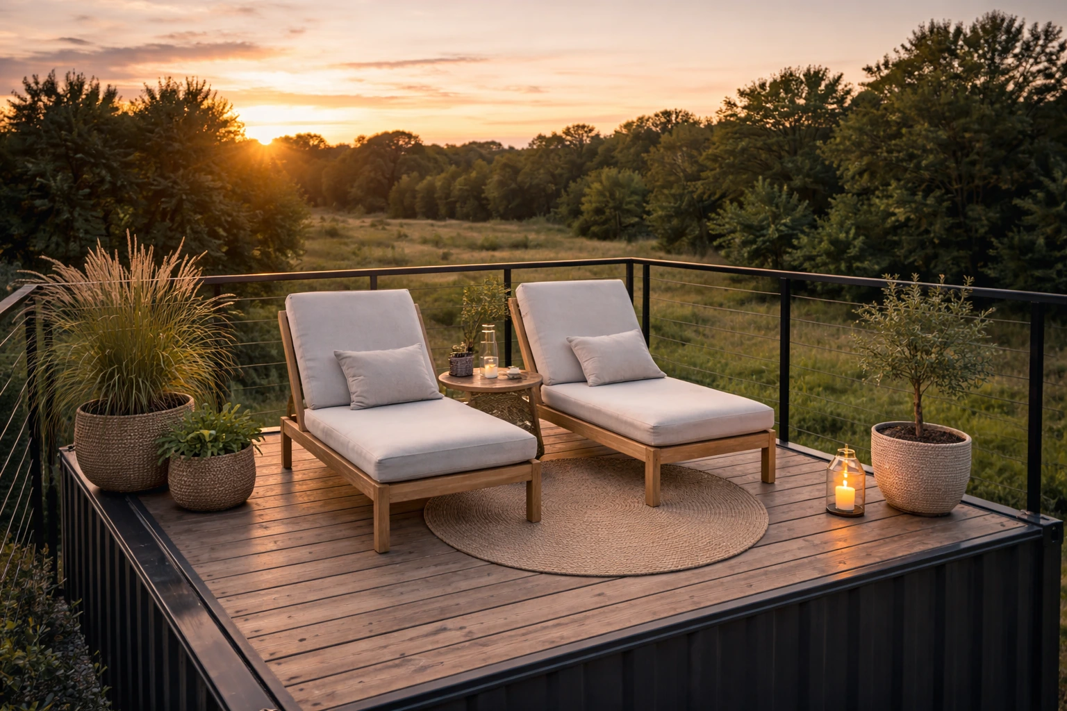 Now the entrance tells the whole story in seconds. A wooden deck softens the steel shell, tall grasses sway around the corners, and warm lighting by the doorway makes the place glow at dusk. The original cargo doors are still there as a design feature, but behind them sits a modern glass entry that immediately changes the mood. It no longer feels like a container. It feels like a secret waiting to be opened.