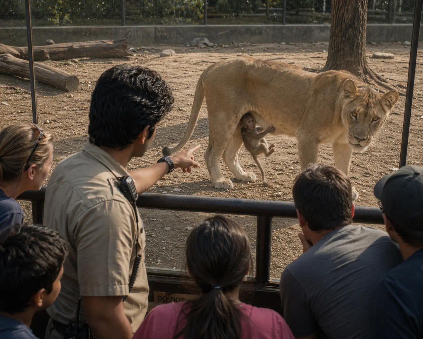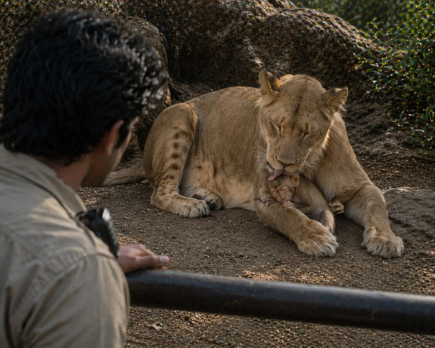 The zoo didn’t celebrate. Not yet. Behind the scenes, urgency replaced awe. “We can’t leave him there,” someone said. Arjun didn’t respond immediately. His eyes were still fixed on the enclosure. Inside, the lioness hadn’t moved far. Milo remained close, tucked against her as if the chaos from before had never happened.